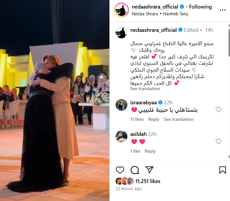 وتابعت نداء شرارة: "تشرفت بغنائي في الحفل السنوي لنادي سيدات السلاح الجوي الملكي، شكرا لمحبتكم وتقديركم دمتم رائعين، كل الحب الكم جميعًا”.
