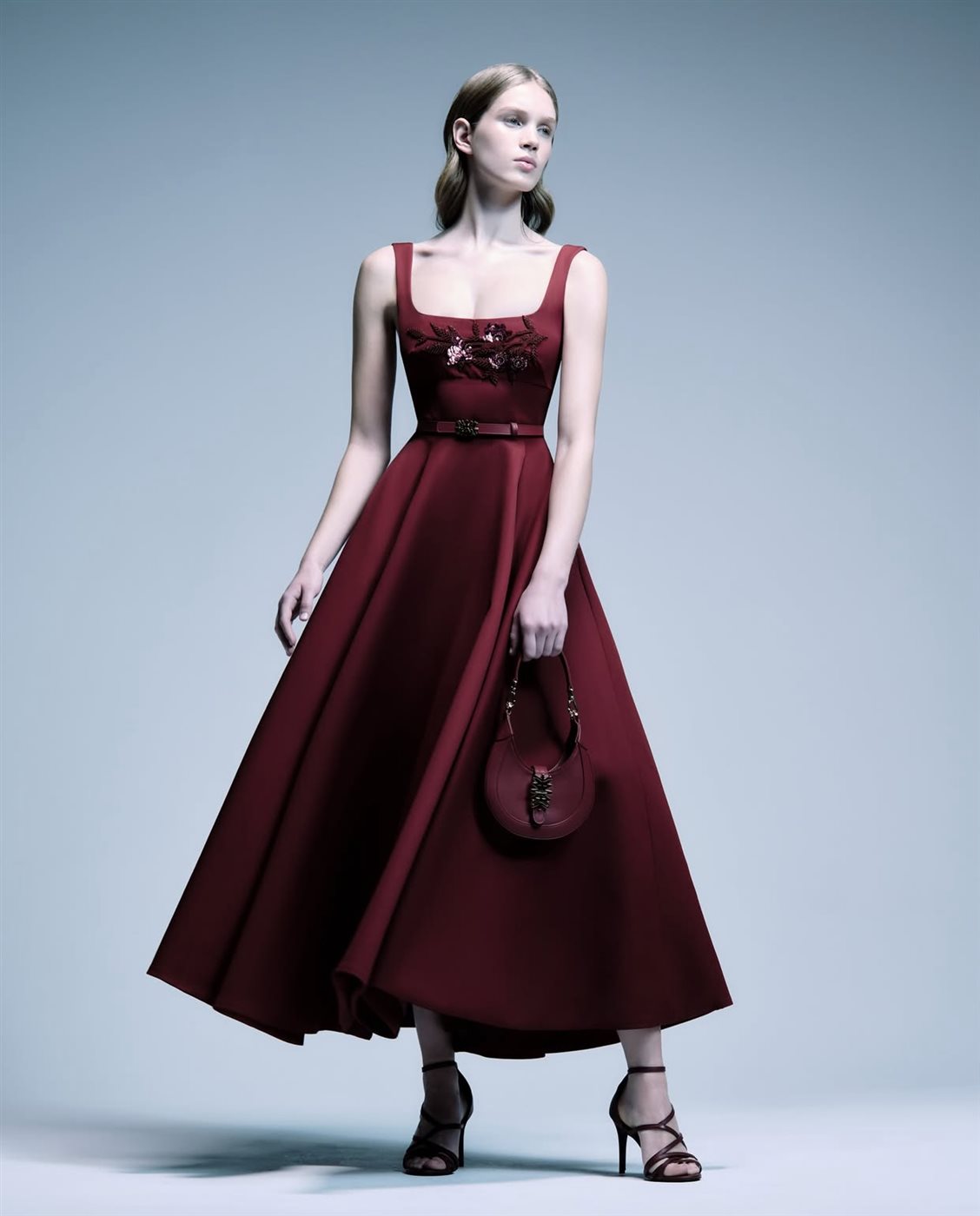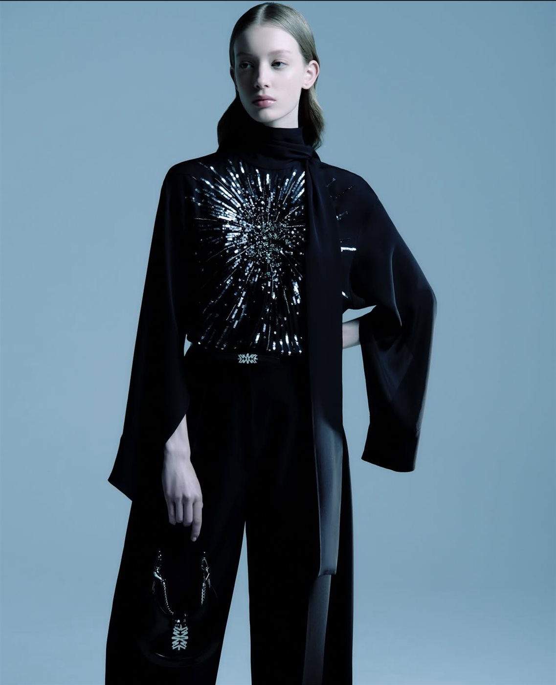 واعتمد إيلي صعب مزيجاً من النقشات غير المألوفة مثل طبعة المربعات مع نقاط البولكا وجلد الثعبان، إلى جانب تناغم لافت بين الأقمشة اللامعة والخامات الجلدية.