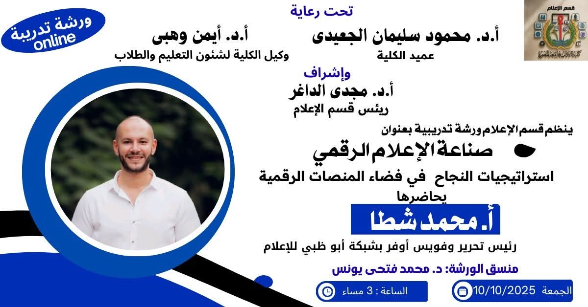 بالتعاون مع شبكة أبو ظبى للاعلام، يعقد قسم الإعلام بكلية الآداب جامعة المنصورة اليوم الجمعة ١٠ اكتوبر ورشة تدريبية حول "صناعة الإعلام الرقمي: استراتيجيات النجاح في فضاء المنصات الرقمية " يحاضر فيها أ. محمد شطا - رئيس تحرير شبكة أبو ظبي للإعلام ويدير فعاليات الورشة د. محمد فتحى يونس ود.ايمان شكرى عضوا هيئة التدريس بالقسم .