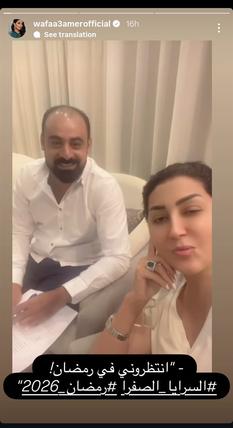 أعلنت النجمة وفاء عامر، عن مشاركتها في الموسم الدرامي الرمضاني لعام 2026 من خلال مسلسل جديد يحمل عنوان "السرايا الصفرا"، وذلك عبر خاصية "ستوري" على حسابها الرسمي بموقع تبادل الصور والفيديوهات الشهير "إنستجرام".