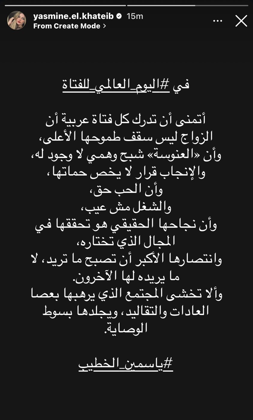 كتبت ياسمين الخطيب: “أتمنى أن تدرك كل فتاة عربية أن الزواج ليس سقف طموحها الأعلى، وأن ”العنوسة" شبح وهمي لا وجود له، والإنجاب قرار لا يخص حماتها، وأن الحب حق، والشغل مش عيب".
