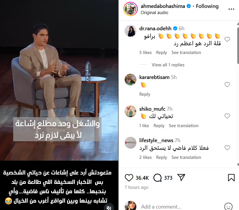 كما وصف أبو هشيمة شائعة ارتباطه بـ “السخيفة”، مطالبًا الجمهور بعدم الانسياق وراء الأخبار مجهولة المصدر.