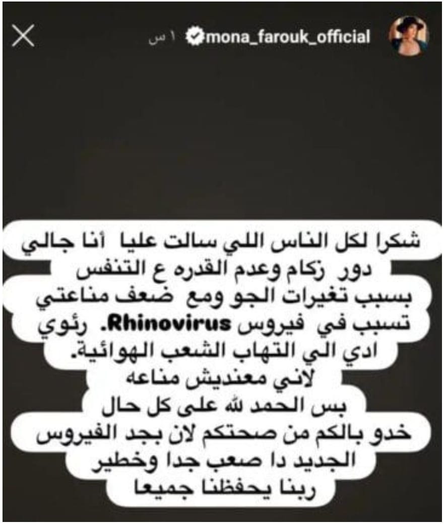 ورغم حدة الأعراض، أكدت منى فاروق عبر حسابها على "إنستجرام" أن حالتها الصحية الآن مستقرة، مشيرة إلى أنها تخضع للعلاج وتحظى برعاية طبية جيدة، كما وجّهت رسالة لمحبيها بضرورة توخي الحذر من تقلبات الجو، خاصة مع دخول فصل الخريف وتزايد حالات الإصابة بأمراض الجهاز التنفسي.
