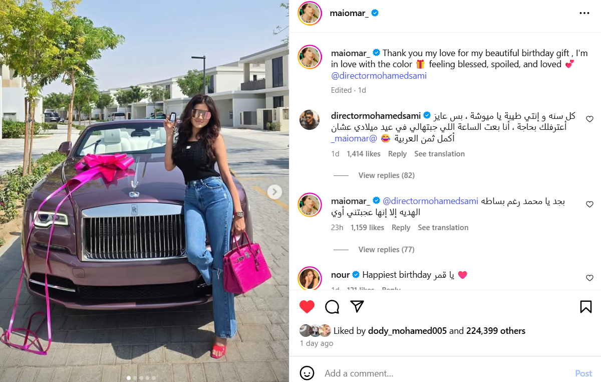 وعلق محمد سامي على منشور مي عمر التي كشفت من خلاله عن إهدائه لها سيارة في عيد ميلادها قائلًا: "كل سنة وإنتي طيبة يا ميوشة، بس عايز أعترفلك بحاجة.. أنا بعت الساعة اللي جبتهالي في عيد ميلادي عشان أكمل ثمن العربية".