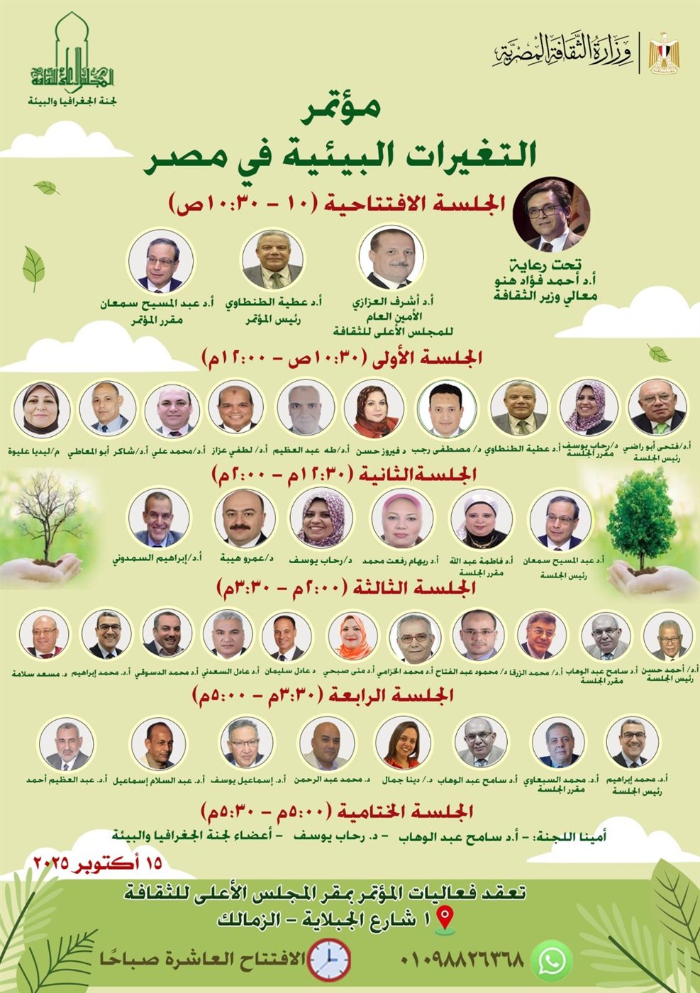 تحت رعاية الدكتور أحمد فؤاد هنو وزير الثقافة، والدكتور أشرف العزازي الأمين العام للمجلس الأعلى للثقافة، يطلق المجلس الأعلى للثقافة مؤتمر: "التغيرات البيئية في مصر"، والذي تنظمه لجنة الجغرافيا والبيئة بالمجلس برئاسة الدكتور عطية الطنطاوي مقرر لجنة الجغرافيا والبيئة، والذي يقام في تمام الساعة التاسعة صباح يوم الأربعاء الموافق ١٥ أكتوبر الحالي وتمتد الفعاليات حتى الخامسة والنصف مساء، بمقر المجلس الأعلى للثقافة باحة دار الأوبرا المصرية.