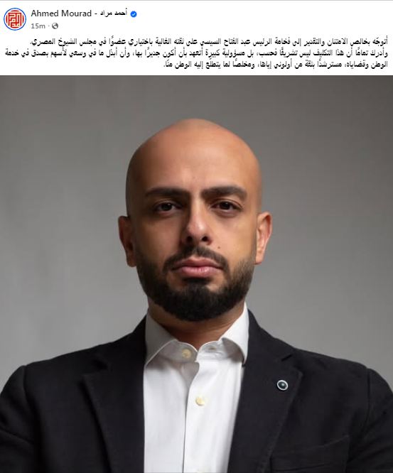 توجه الكاتب والروائي أحمد مراد، بالشكر والتقدير إلى الرئيس عبد الفتاح السيسي على ثقته في في اختياري عضوًا في مجلس الشيوخ المصري.