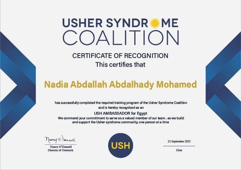 يتقدم المجلس القومي للإعاقة بخالص التهاني والتقدير إلى السيدة / نادية عبدالله، رئيس مجلس أمناء المؤسسة المصرية لحقوق الصم، وموظفة المجلس السابقة، بمناسبة اختيارها سفيرة لمتلازمة أشر (الصم المكفوفين) في جمهورية مصر العربية من قبل التحالف العالمي لمتلازمة أشر، وذلك تقديرًا لجهودها الرائدة والمستمرة في دعم وتمكين الأشخاص من الصم المكفوفين، وإسهامها الفاعل في نشر الوعي بهذه الفئة المهمة من الأشخاص ذوي الإعاقة.