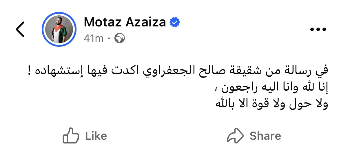 أعلنت شقيقة صالح الجعفراوي وفقًا لما نشره الصحفي معتز عزايزة وفاة شقيقها، حيث كتب عبر حسابه على الفيسبوك، “في رسالة من شقيقة صالح الجعفراوي اكدت فيها إستشهاده !إنا لله وانا اليه راجعون ، ولا حول ولا قوة الا بالله”.