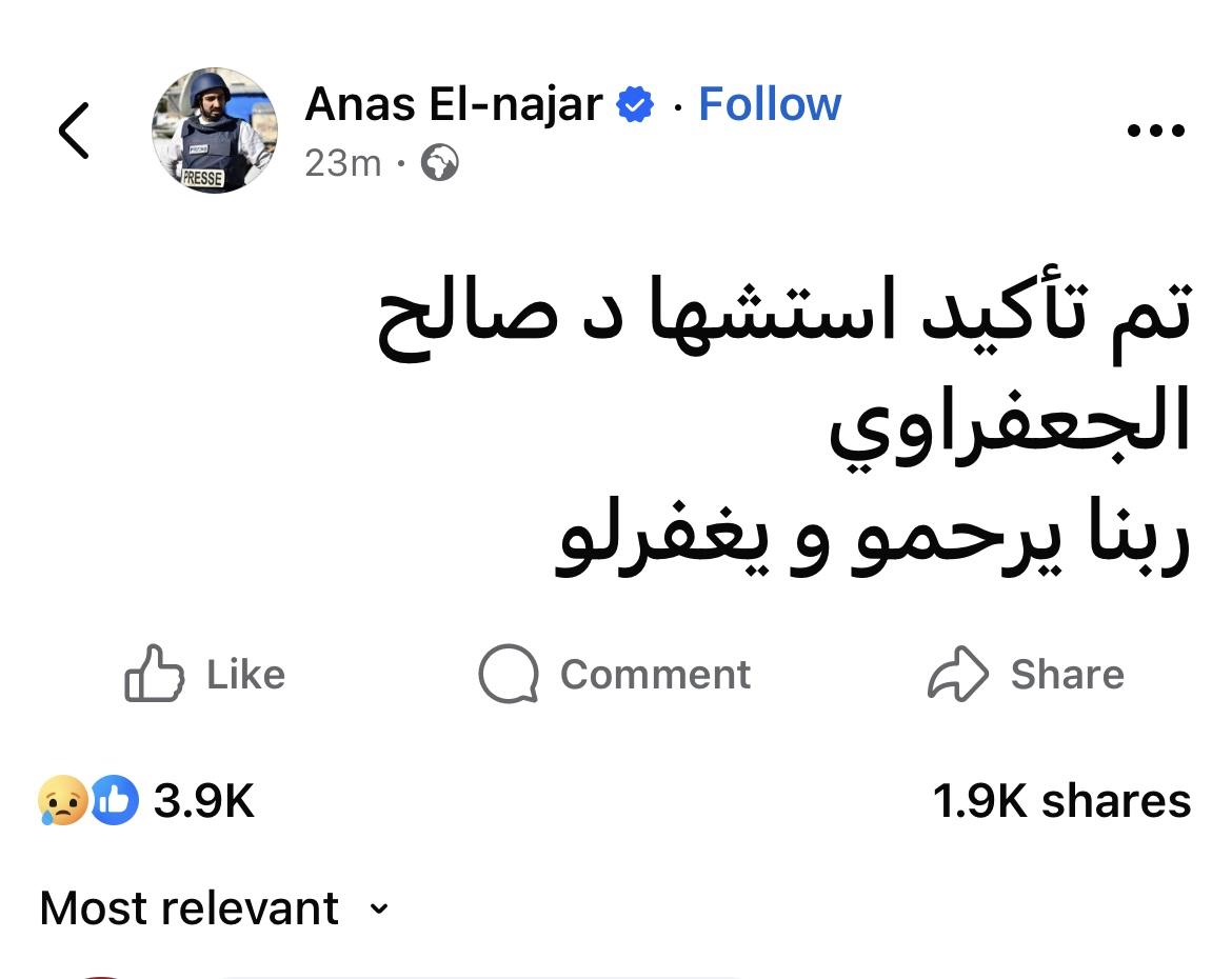 كما أكد الصحفي الفلسطيني، أنس النجار منذ قليل استشهاد الصحفي صالح الجعفراوي، أثناء تأدية عمله الصحفي في تغطية الأحداث الجارية في قطاع غزة، وذلك خلال منشور كتبه عبر الفيسبوك قائلا :" تم تأكيد استشهاد صالح الجعفراوي ربنا يرحمو و يغفرلو".