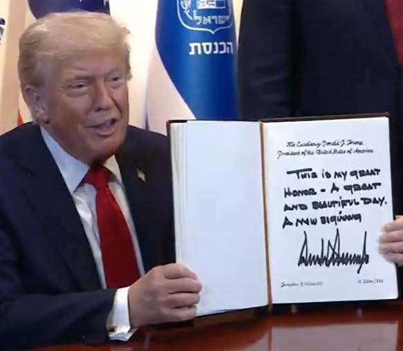 في مشهدٍ لافتٍ حمل رمزية سياسية ورسائل غير مباشرة، دوّن الرئيس الأمريكي دونالد ترامب، صباح اليوم الاثنين، بخط يده عبارة أثارت الفضول والجدل في آن واحد داخل الكنيست الإسرائيلي، كتب فيها: “يشرفني هذا اليوم العظيم والجميل.. إنها بداية جديدة”، كلمات قليلة، لكنها فتحت باب التأويل واسعًا حول ما أراد ترامب أن يلمّح إليه في هذه المرحلة الحساسة من مسار الحرب الدامية التي شنها الاحتلال الإسرائيلي على مدار عامين في غزة.