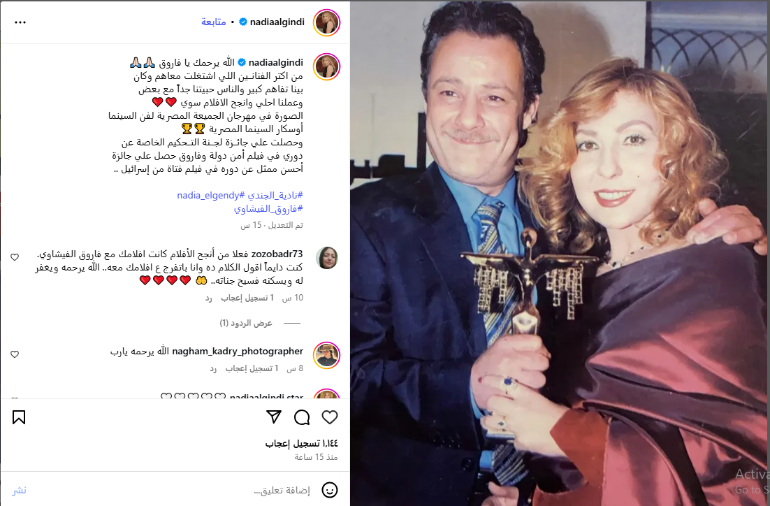 علقت الجندي على الصورة، قائلة:"الله يرحمك يا فاروق، من أكثر الفنانين اللي اشتغلت معاهم وكان بينا تفاهم كبير، والناس حبيتنا جدًا مع بعض، وعملنا أحلى وأنجح الأفلام سوا".