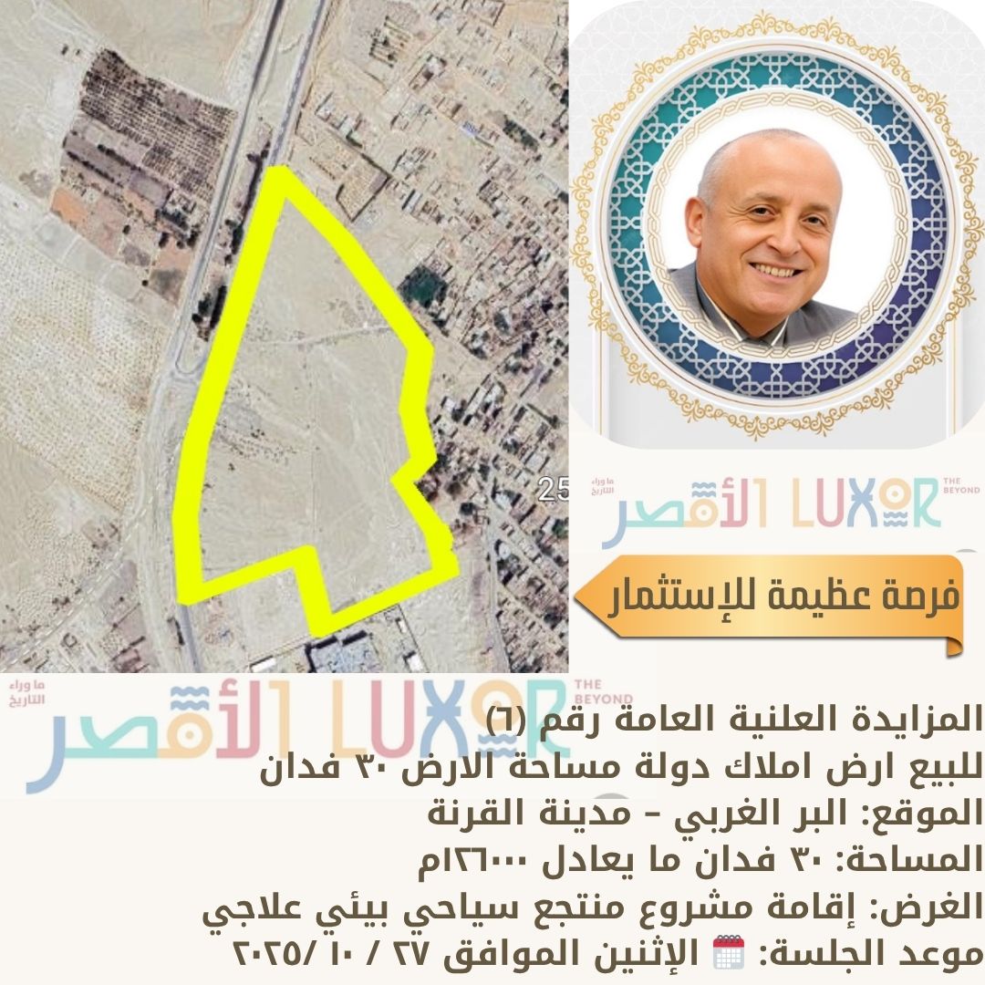 اولاً : المزايدة العلنية العامة رقم (6): لبيع قطعة أرض بمساحة 30 فدانًا (ما يعادل 126,000 متر مربع) بالبر الغربي بمدينة القرنة، لإقامة منتجع سياحي بيئي علاجي، وتُعقد جلسة المزايدة يوم الاثنين الموافق 27 أكتوبر 2025.