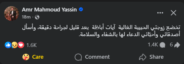 طالب عمرو محمود ياسين الجمهوره بالدعاء لزوجته بالشفاء العاجل والسلامة، قائلا: “تخضع زوجتي الحبيبة الغالية آيات أباظة بعد قليل لجراحة دقيقة، وأسأل أصدقائي وأحبّائي الدعاء لها بالشفاء والسلامة”.