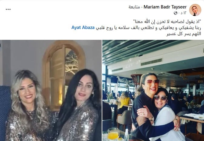 وكتبت منة تيسير: "إذ يقول لصاحبه لا تحزن إن الله معنا" ربنا يشفيكى ويعافيكى وتطلعي بالف سلامه يا روح قلبى..اللهم يسر كل عسير"،