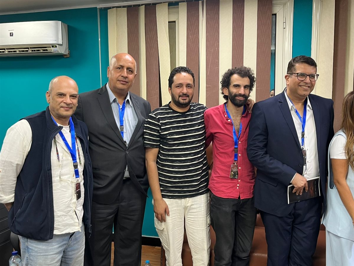 لجنة تحكيم مهرجان المهن التمثيلية المسرحي يتوسطهم أشرف زكي قبل متابعة العروض