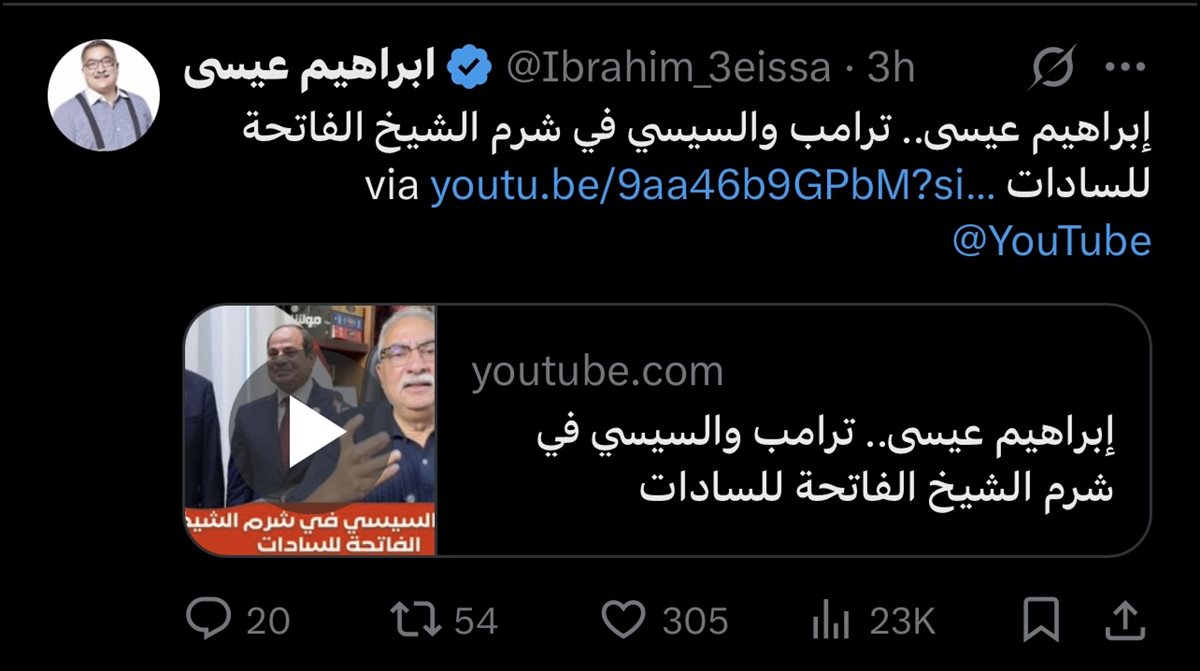 وكان قد علق الإعلامي إبراهيم عيسى على اتفاق وقف إطلاق النار والحرب في قطاع غزة، بعد اجتماعات شرم الشيخ، عبر حسابه الشخصي بمنصة التغريدات المصغرة "إكس"، قائلًا؛ "جمال عبدالناصر أنقذ الفلسطينيين من مأساة أيلول الأسود 1970. أنور السادات حاول أن ينقذهم في 1979 ورفضوا، حسني مبارك أنقذهم في مذبحة وغزو بيروت 82 وأنقذهم في أوسلو 93".