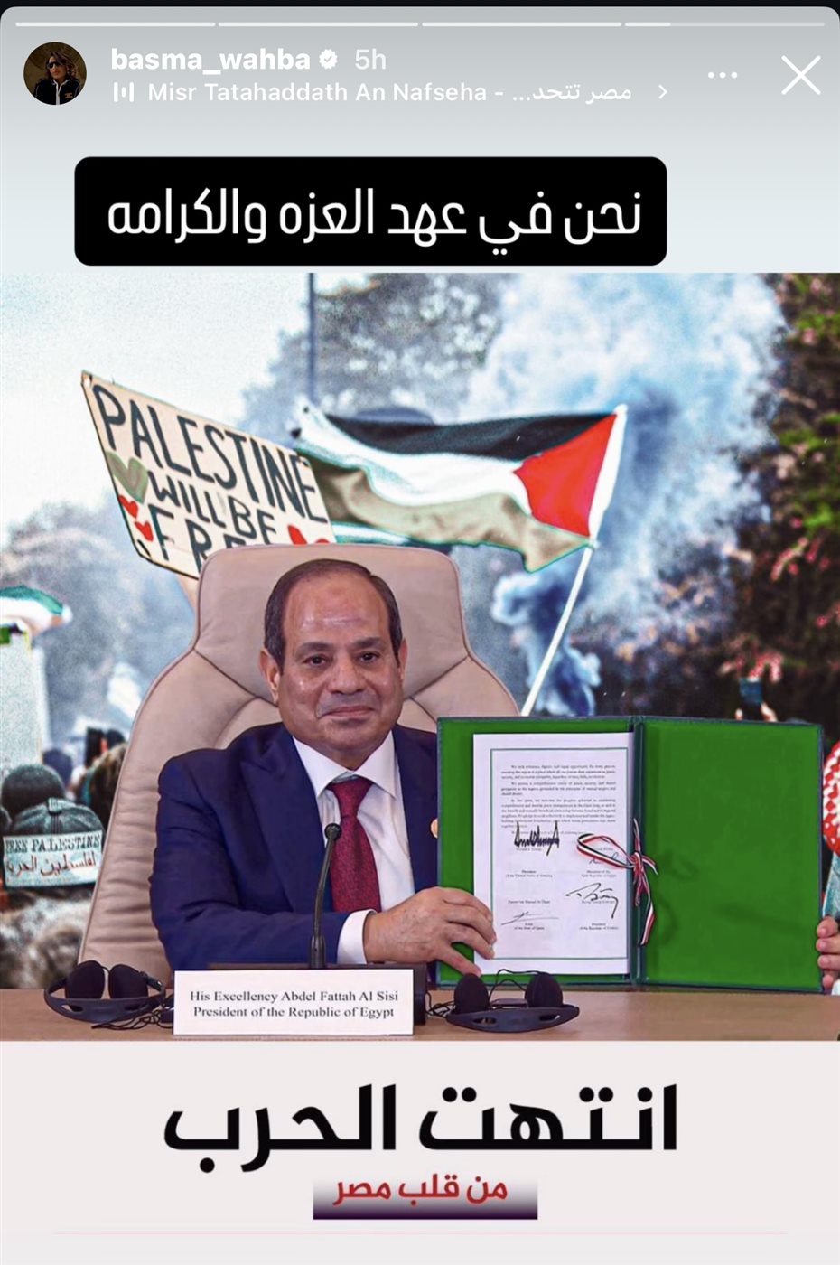 نشرت بسمة وهبة صورة الرئيس السيسي من قمة شرم الشيخ للسلام، وأرفقتها بتعليق قائلة: “نحن في عهد العزة والكرامة”، مضيفة: “انتهت الحرب من قلب مصر”.