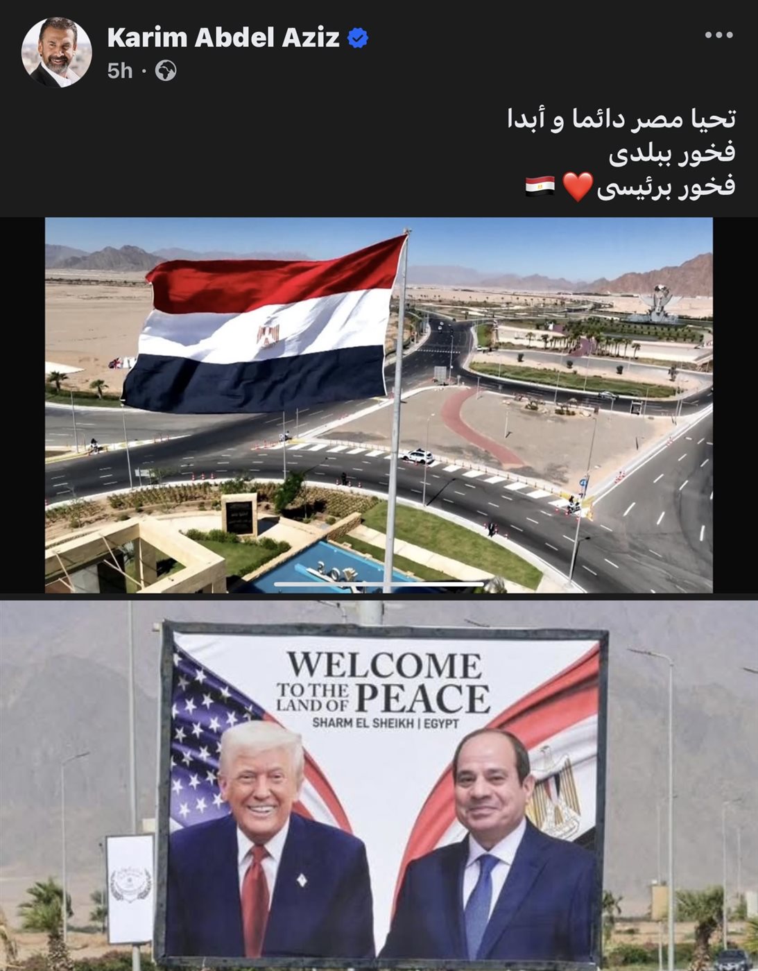 أعرب النجم كريم عبد العزيز عن فخره بجهود الرئيس عبد الفتاح السيسي لتوقيع اتفاق شرم الشيخ، ودعم مسار السلام بالشرق الأوسط، خلال قمة شهدت حضور نحو 20 من قادة دول العالم.