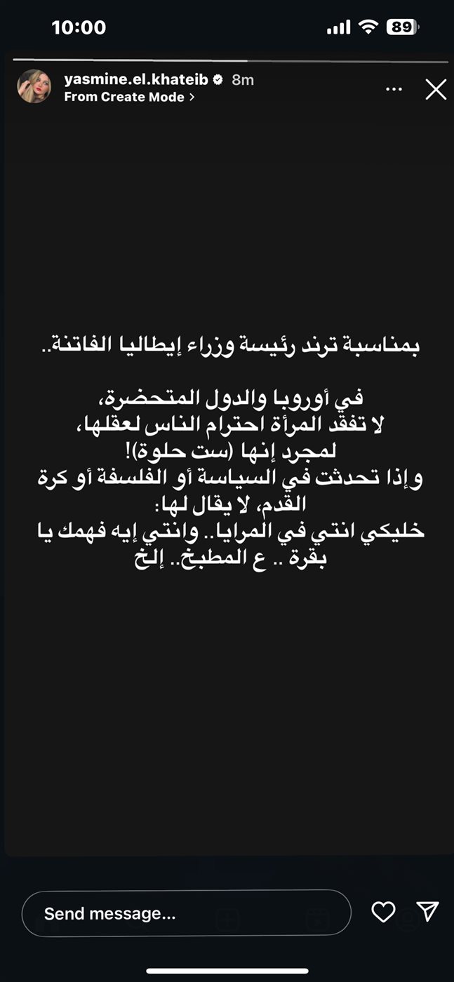 وكتبت ياسمين الخطيب: “بمناسبة ترند رئيسة وزراء إيطاليا الفاتنة.. في أوروبا والدول المتحضرة لا تفقد المرأة احترام الناس لعقلها، لمجرد إنها ست حلوة)! وإذا تحدثت في السياسة أو الفلسفة أو كرة القدم، لا يقال لها : خليكي انتي في المرايا.. وانتي إيه فهمك يا بقرة .. ع المطبخ.. إلخ”.