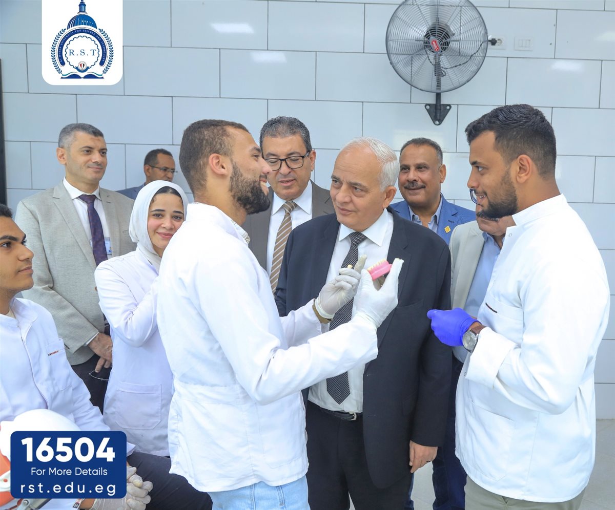 واستمع رئيس الجامعة خلال زيارة كلية طب الفم والاسنان بحضور الدكتور جمال معتمد عميد الكلية لآراء الطلاب في المواد التعليمية ومدي استفادتهم من التدريبات العملية في المعامل .