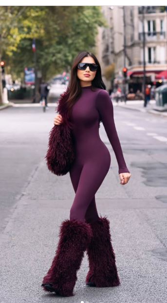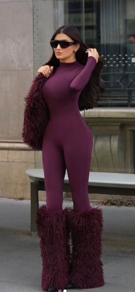 وبدت مي عمر بإطلالة لافته، مرتديه جمبسوت مجسم بأكمام طويلة، صمم من قماش اللاميه باللون الباذنجاني وزين بقطع الفرو الناعم من أسفل الأقدام، الجمبسوت عكس قوامها الرشيق ووزنها المثالي.