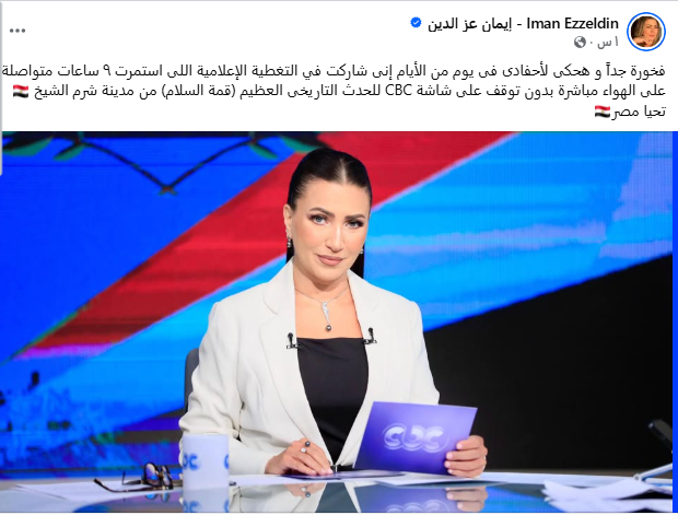 ونشرت إيمان عبر صفحتها الرسمية على موقع "فيسبوك" قائلة: "فخورة جدًا وهحكي لأحفادي في يوم من الأيام إني شاركت في التغطية الإعلامية اللي استمرت 9 ساعات متواصلة على الهواء مباشرة بدون توقف على شاشة CBC للحدث التاريخي العظيم (قمة السلام) من مدينة شرم الشيخ.. تحيا مصر."