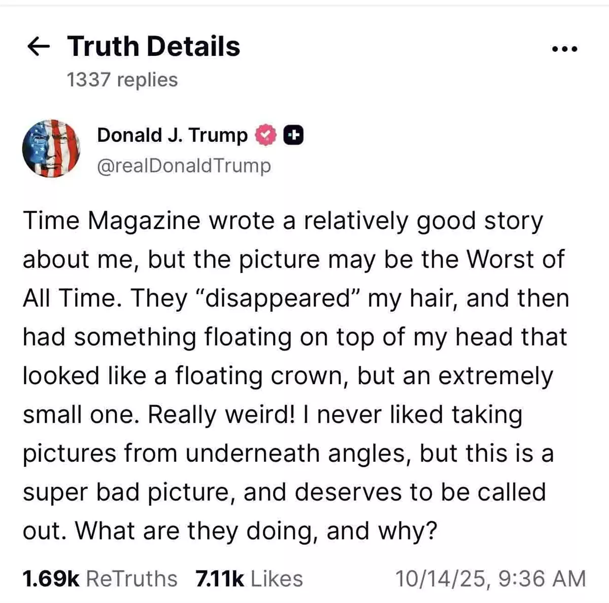 وكتب ترامب: "كتبت مجلة تايم قصة جيدة نسبيًا عني، لكن الصورة ربما تكون الأسوأ على الإطلاق، لقد "أخفوا" شعري، ثم ظهر شيء عائم فوق رأسي يشبه تاجًا عائمًا، ولكنه صغير جدًا".