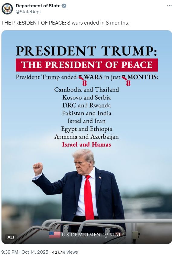 الخارجية الأمريكية تتغنى بترامب: "رئيس السلام الذي أنهى 8 حروب خلال 8 أشهر"