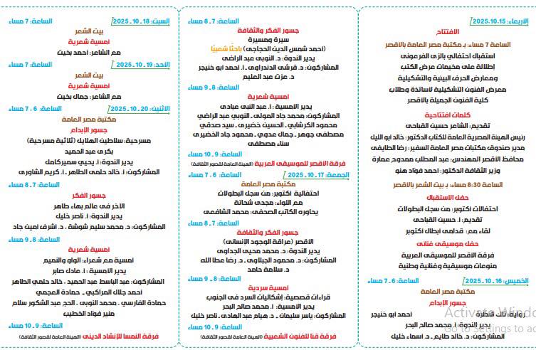 ويتضمن اليوم الافتتاحي عرضا فنيا لفرقة أطفال الأقصر للفنون الشعبية، يليه يوم 16 أكتوبر عرضا فنيا لفرقة الأقصر للموسيقى العربية، ويشمل يوم 17 أكتوبر عرضا لفرقة قنا للفنون الشعبية، وتتواصل الفعاليات يوم 20 أكتوبر مع عرض فني لفرقة النمسا للإنشاد الديني، إلى جانب عرض فني لفرقة قنا للموسيقى العربية يوم 23 أكتوبر، فيما تشارك فرقة الأقصر للفنون الشعبية في فعاليات اليوم الختامي.