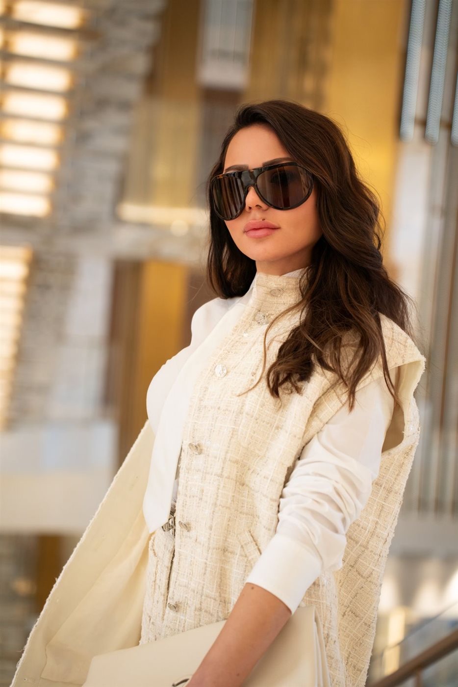 اختارت أسما ساعة راقية من Fendi أضافت بريقًا ناعمًا لمعصمها، بينما جاءت النظارات الشمسية الضخمة من Miu Miu لتمنح الإطلالة طابعًا جريئًا وعصريًا.