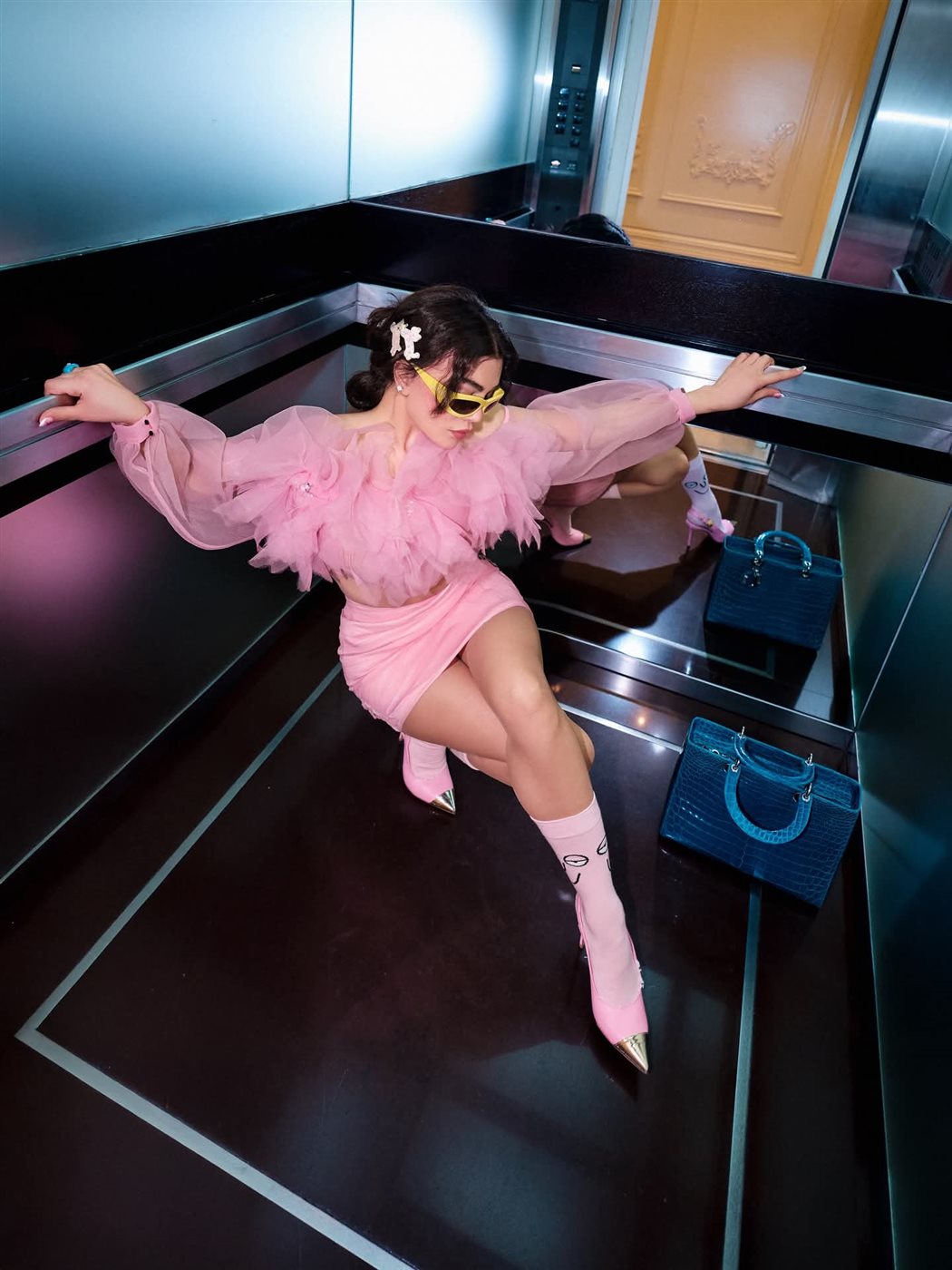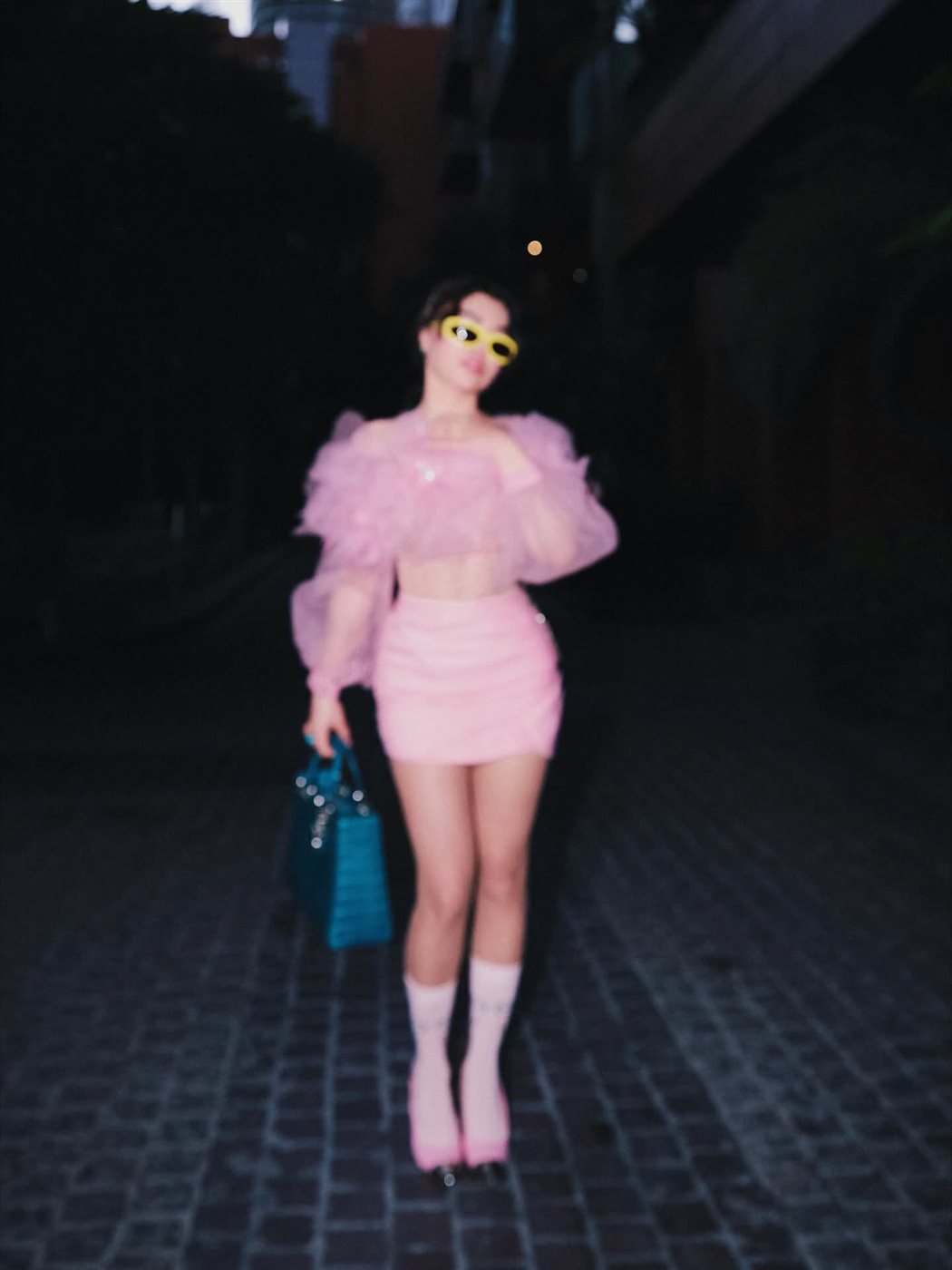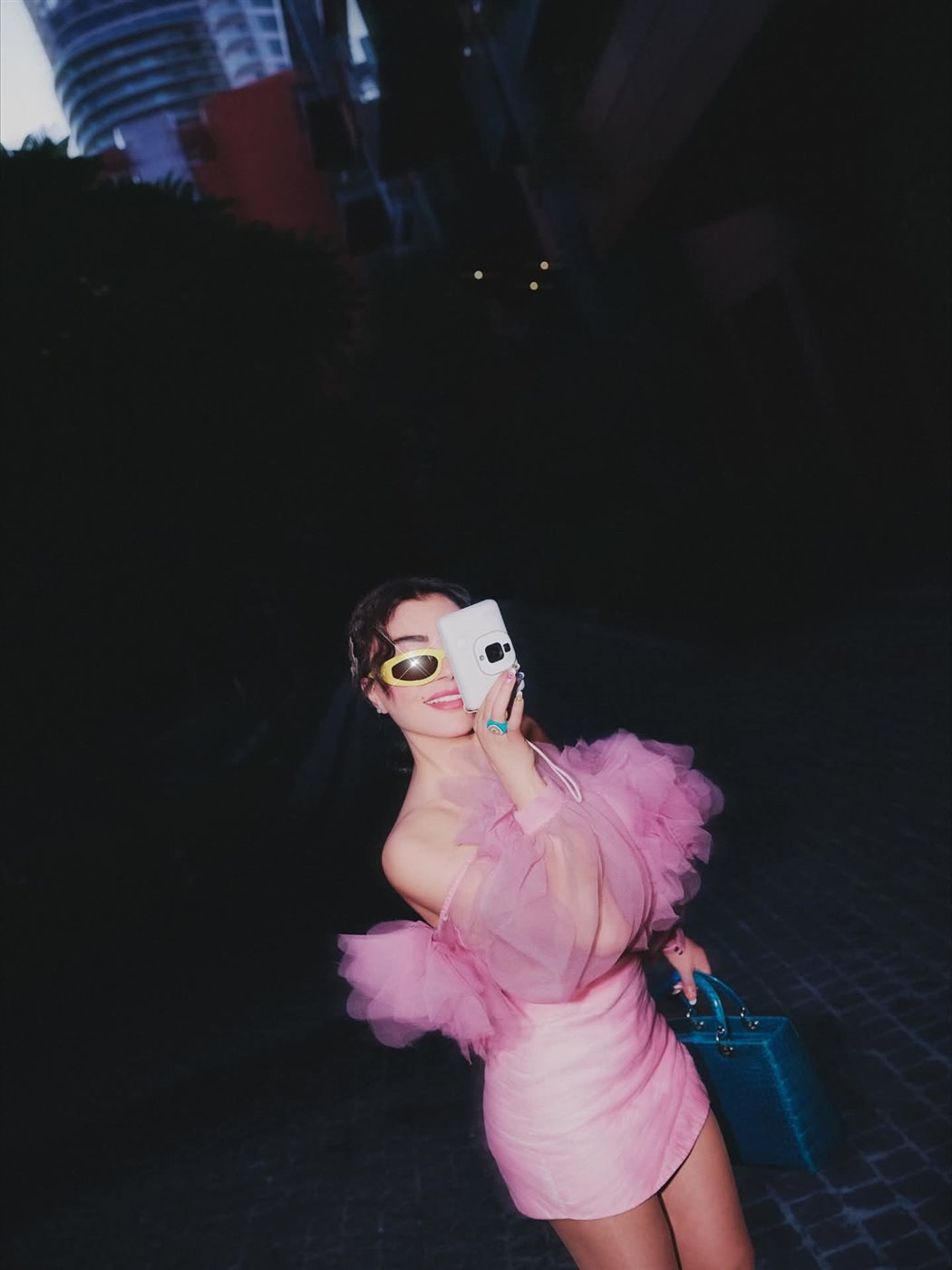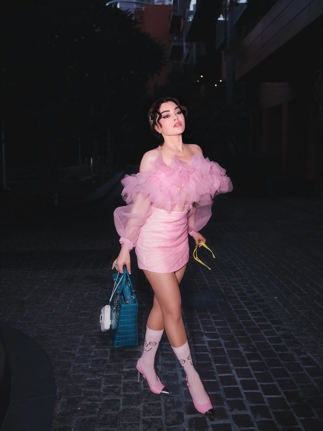 وبدت هيفاء وهبي بإطلالة ساحرة مزجت بين الأنوثة والجاذبية في آن واحد، مرتدية فستان قصير مجسم، بأكمام طويلة، صمم من قماش التل الناعم بلون البينك الفاتح فيما انتعلت حذاء بكعب عال، ونسقت عليه حقيبة يد صممت من الجلد بلون الجنزاري.