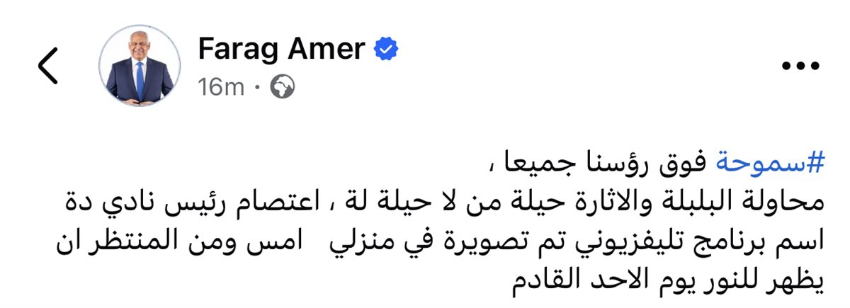 أثار المهندس فرج عامر رئيس نادي سموحة والمرشح على نفس المنصب بالإنتخابات القادمة المنتظر عقدها فى ٢٨ نوفمبر المقبل، جدلا واسعًا بالمنشور الذي نشره أمس الأربعاء، على صفحته الرسمية الموثقة باسمه باللغة الإنجليزية على “فيسبوك” بأن إعتصام الرئيس بالنادى سيكون الأحد المقبل والذى حذفه بعد دقائق من نشره بأنه ليس الا مجرد اعلان عن برنامج تليفزيونى جديد تم تصويره معه.