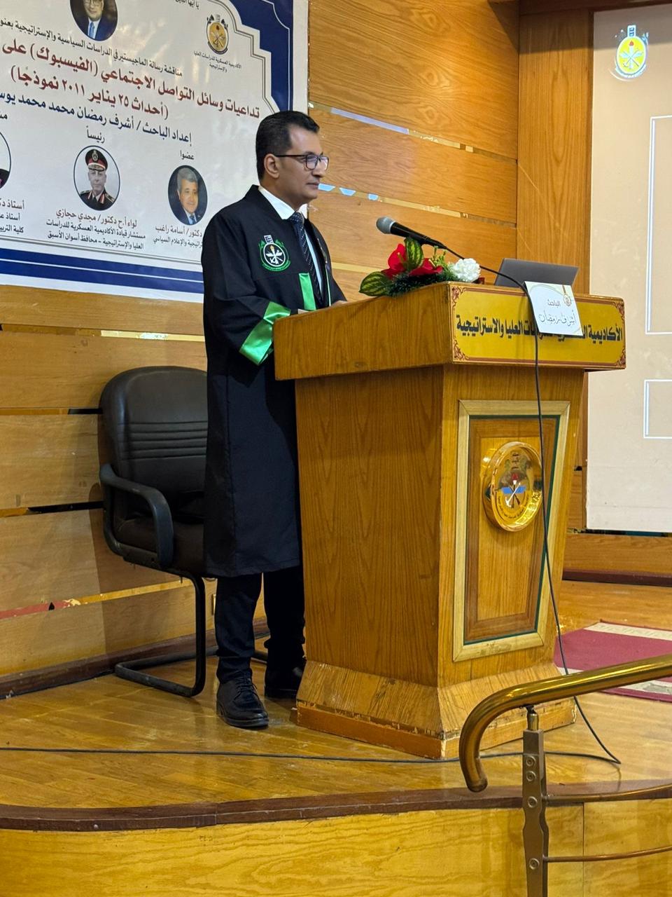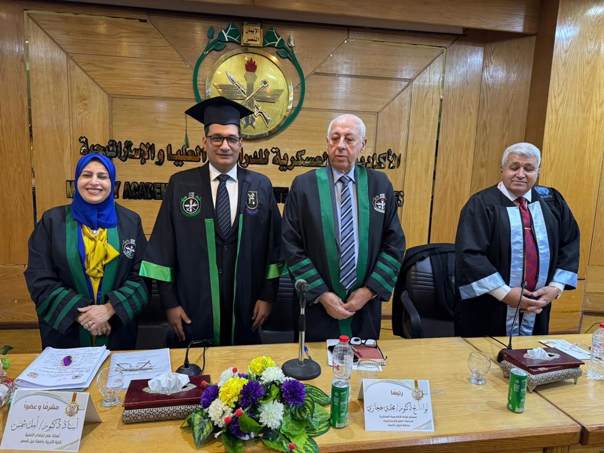 وترأس لجنة المناقشة اللواء أركان حرب الدكتور مجدي حجازي، مستشار قيادة الأكاديمية العسكرية للدراسات العليا والاستراتيجية، وعضوية كل من اللواء أركان حرب الدكتور أسامة راغب، أستاذ الاستراتيجية والإعلام السياسي، والأستاذة الدكتورة أمل شمس، أستاذ علم اجتماع التنمية بكلية التربية – جامعة عين شمس، حيث أجازت اللجنة الرسالة بعد مناقشة علمية موسعة أثنت فيها على الجهد البحثي ومنهجيته الدقيقة.