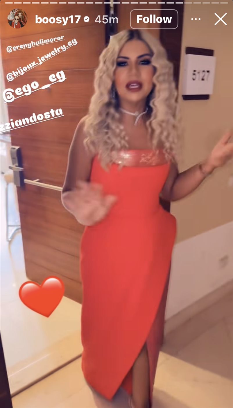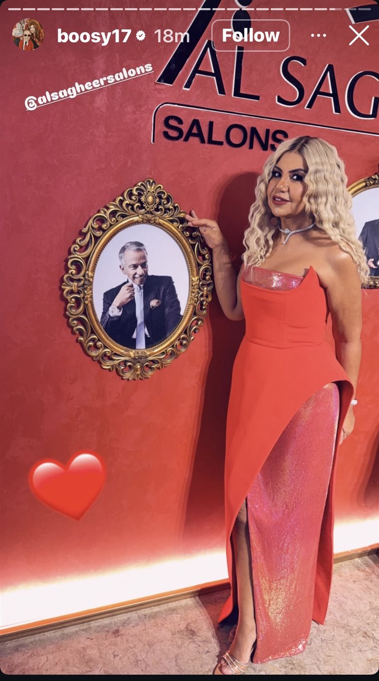 وظهرت بوسي بفستان أنيق باللون الأحمر القاني بتصميم ضيق أبرز رشاقتها بانسيابية لافتة، وتضمن فتحة أمامية أنيقة أضفت لمسة من الجاذبية والرقي على الإطلالة، ليعكس اختياراتها المميزة في المناسبات الكبرى.