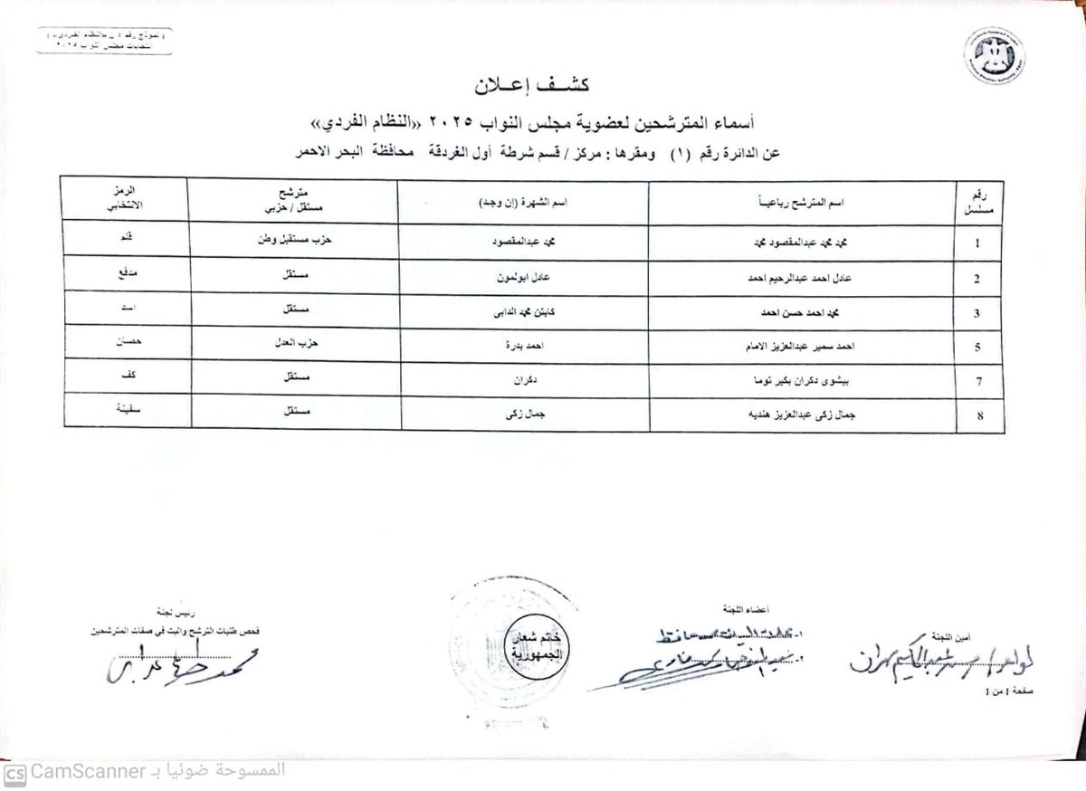 هذا وتعلن اللجنة المشرفة على أنتخابات النواب بالبحر الأحمر صباح غدا الخميس الكشف المبدئي الخاص بالمرشحين المحتملين الذين تقدموا بأوراقهم .