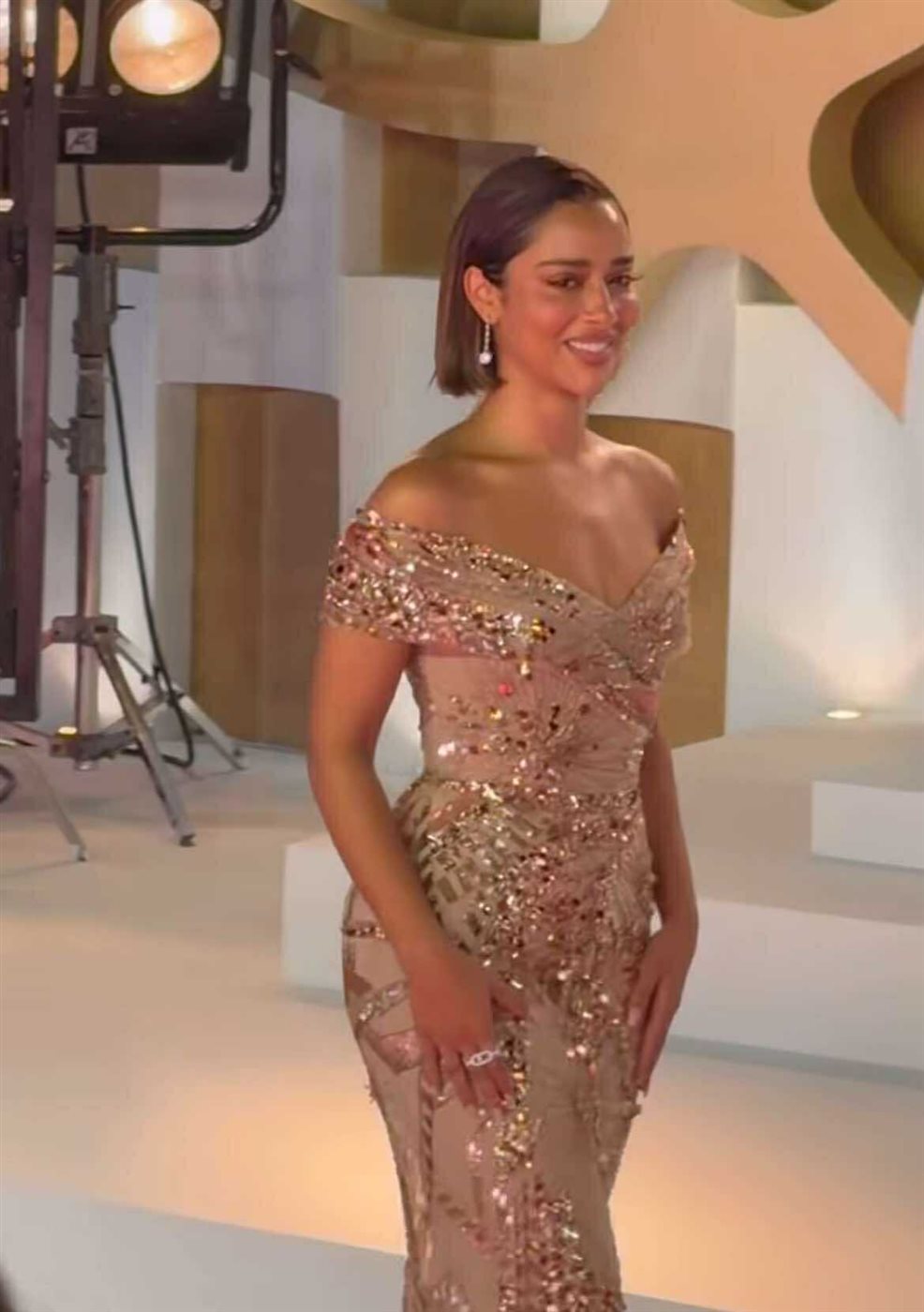 وتألقت بلقيس فتحي صاحبة الطلة الذهبية بإطلالة لافته، تتناغم مع شخصيتها المتمردة، مرتديه فستان طويل مجسم، ينتمي لقصه الأوف شولدر، صمم من قماش فاخر مطزر بالخرز والترتر الذهبي، الفستان عكس قوامها الرشيق الذي يشبه عارضات الأزياء العالميات.