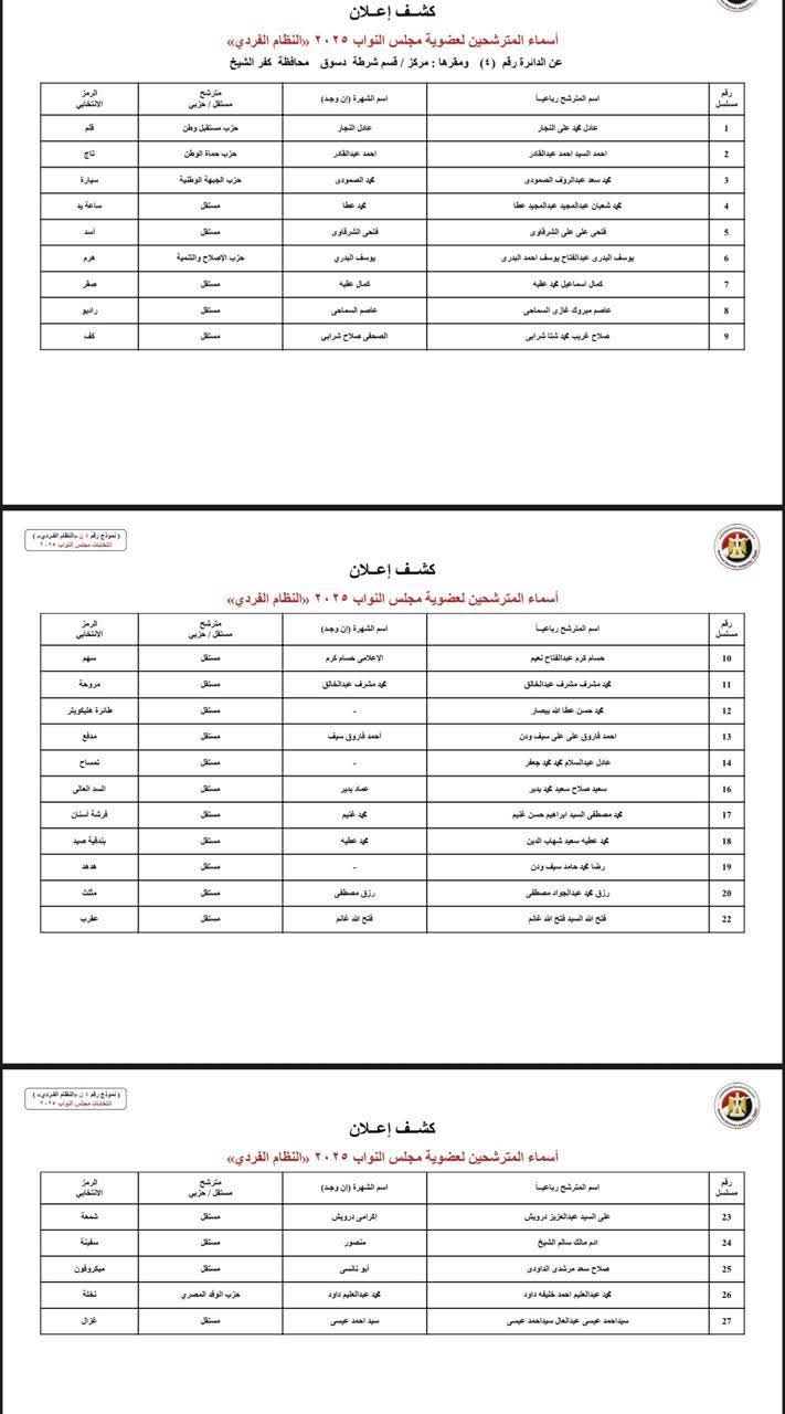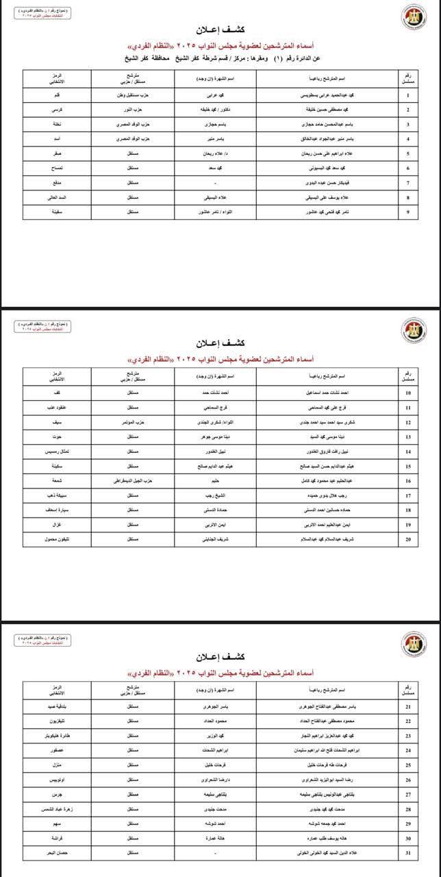 أعلنت الهيئة الوطنية للانتخابات، اليوم، القائمة المبدئية لأسماء المترشحين على النظام الفردي لانتخابات مجلس النواب 2025 في دوائر محافظة كفر الشيخ.