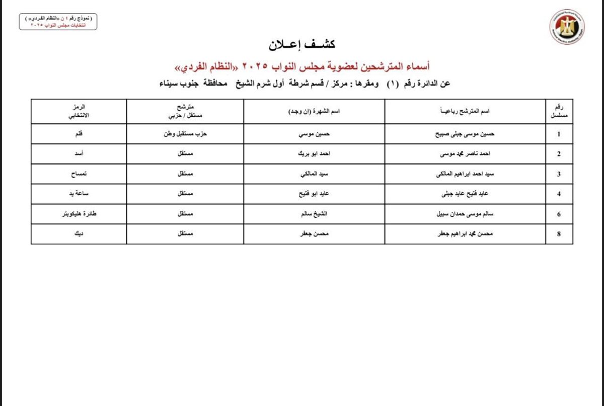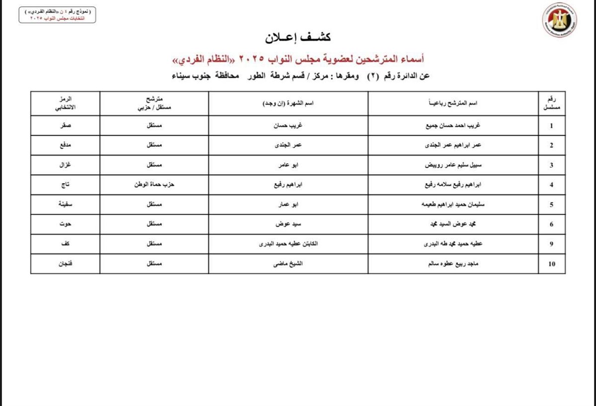 أعلنت الهيئة الوطنية للانتخابات اليوم الكشف المبدئي لأسماء المرشحين بنظام الفردي لانتخابات مجلس النواب في محافظة جنوب سيناء، في خطوة رسمية تستكمل خريطة المنافسة الانتخابية قبل بدء الإجراءات النهائية للدعوة العامة للناخبين.