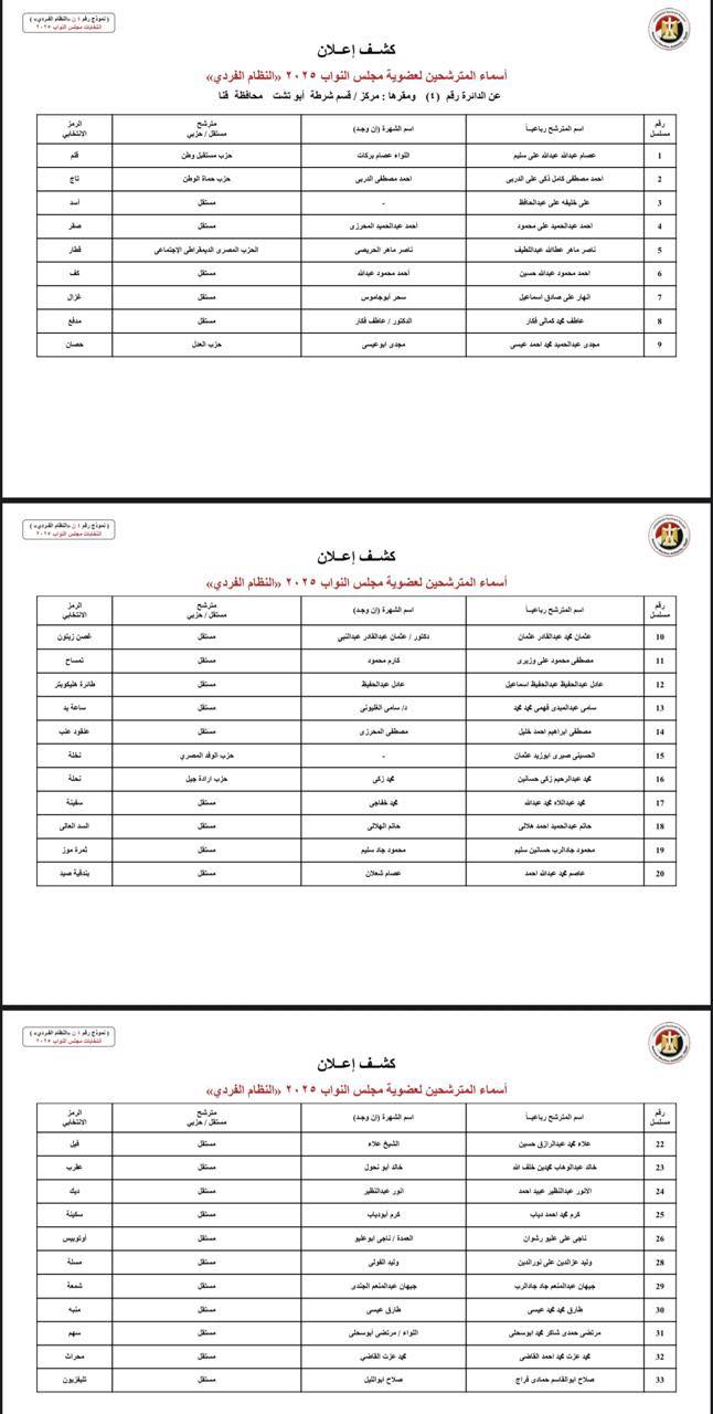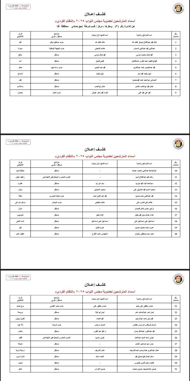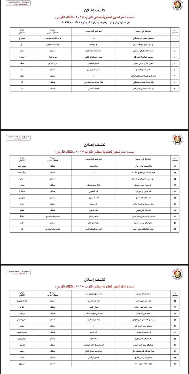 أصدرت الهيئة الوطنية للانتخابات بمحافظة قنا القائمة المبدئية للمرشحين المتقدمين للانتخابات البرلمانية على المقاعد الفردية، لتدخل المحافظة مرحلة التنقية والتدقيق القانوني قبل انطلاق الحملات الرسمية.