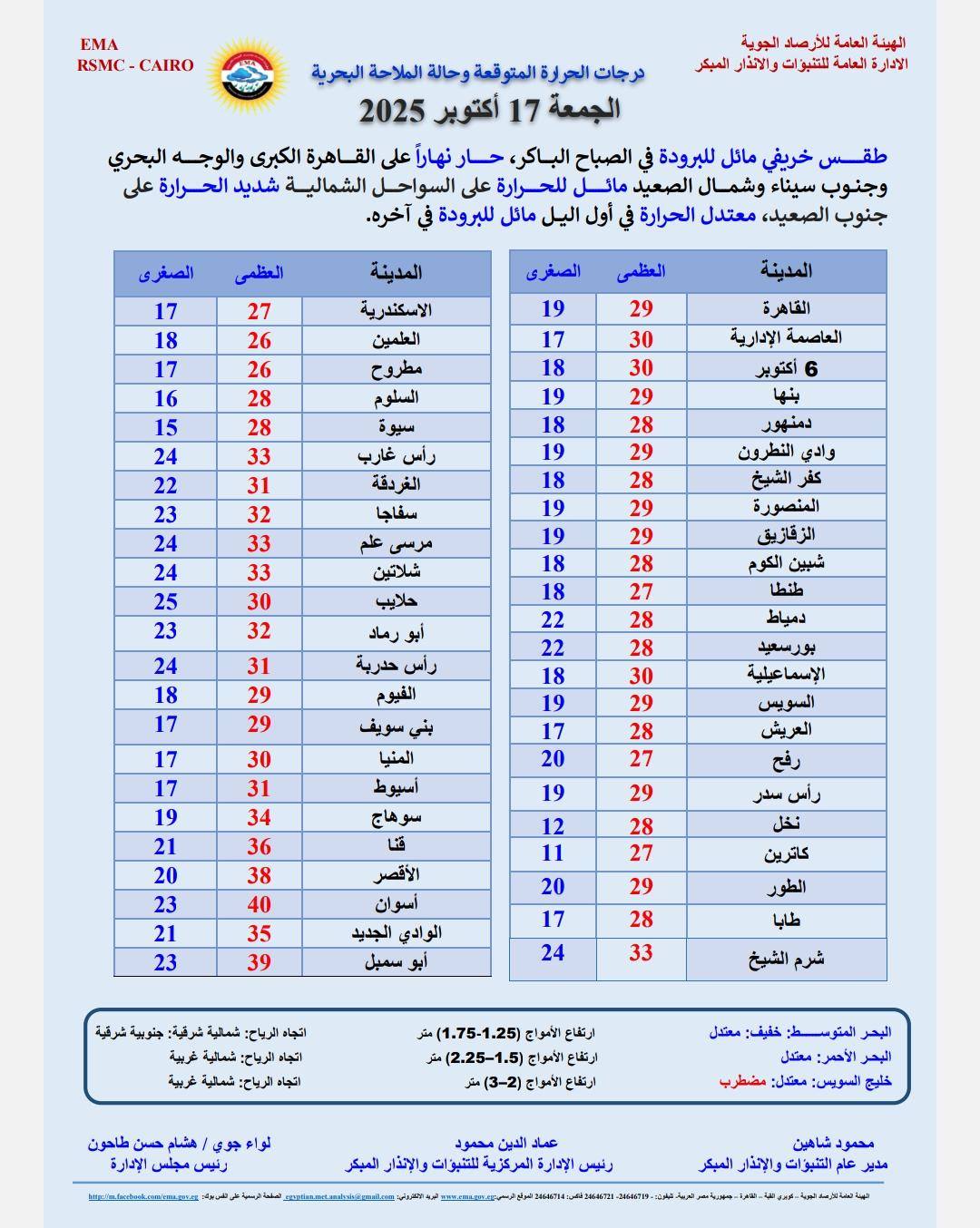 يسود اليوم الجمعة الموافق 17 أكتوبر طقس خريفي مائل للبرودة في الصباح وحار نهارًا، ومعتدل الحرارة في أول الليل ومائل للبرودة في أخره.