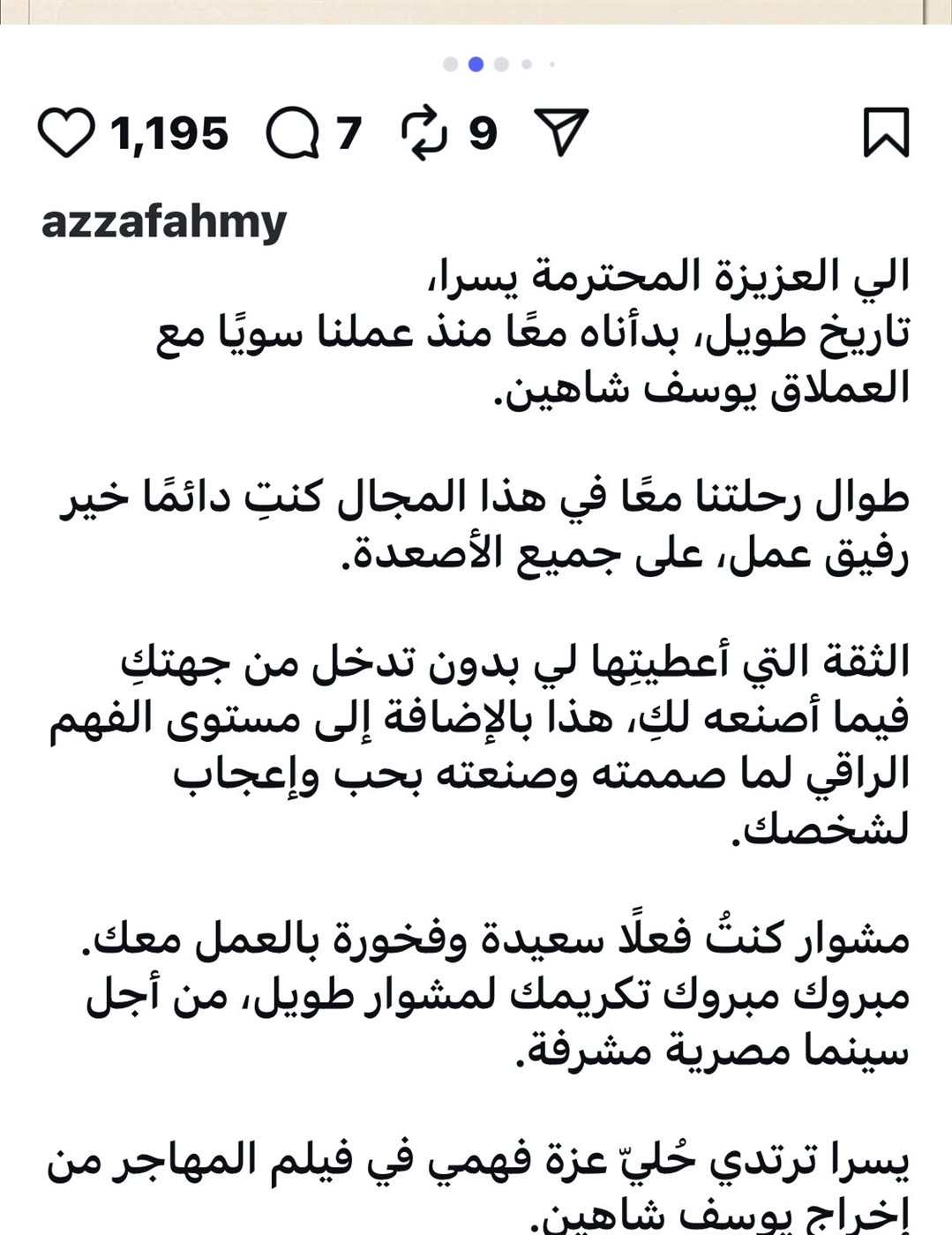 ونشرت عزة فهمي عبر حسابها على إنستجرام صورًا من بوستر الفيلم وأخرى تجمعها بيسرا، وعلقت قائلة: «إلى العزيزة المحترمة يسرا، تاريخ طويل بدأناه معًا منذ عملنا سويًا مع العملاق يوسف شاهين»، مؤكدة عمق الصداقة والاحترام المتبادل بينهما منذ بداية مشوارهما الفني المشترك.