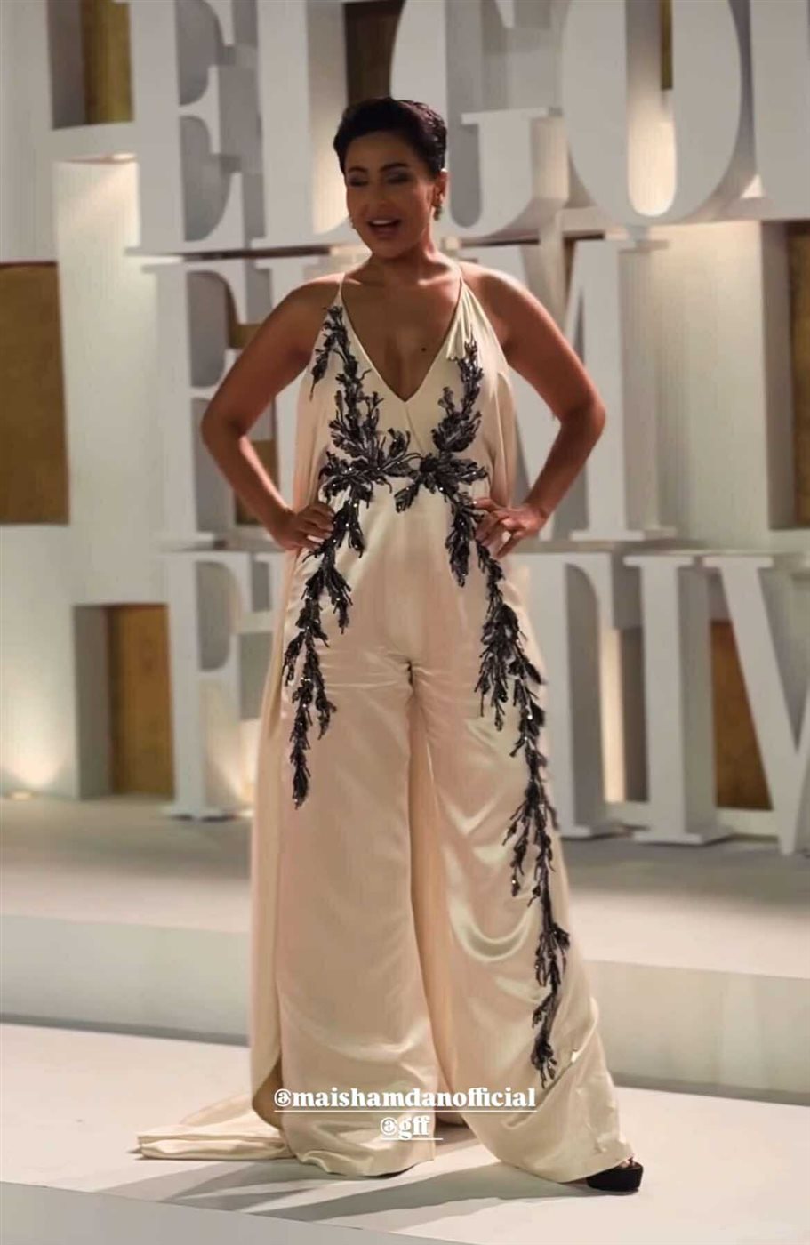 وتميز الجامبسوت بقصته الانسيابية ذات الأكتاف المكشوفة، التي أبرزت أنوثتها، واعتمدت على مكياج هادئ يبرز ملامحها الطبيعية، واكتفت بأقراط صغيرة لامعة لتكمل أناقة الإطلالة ، أما من حيث الإكسسوارات، فاختارت عقدًا راقيًا وأقراطًا ناعمة.