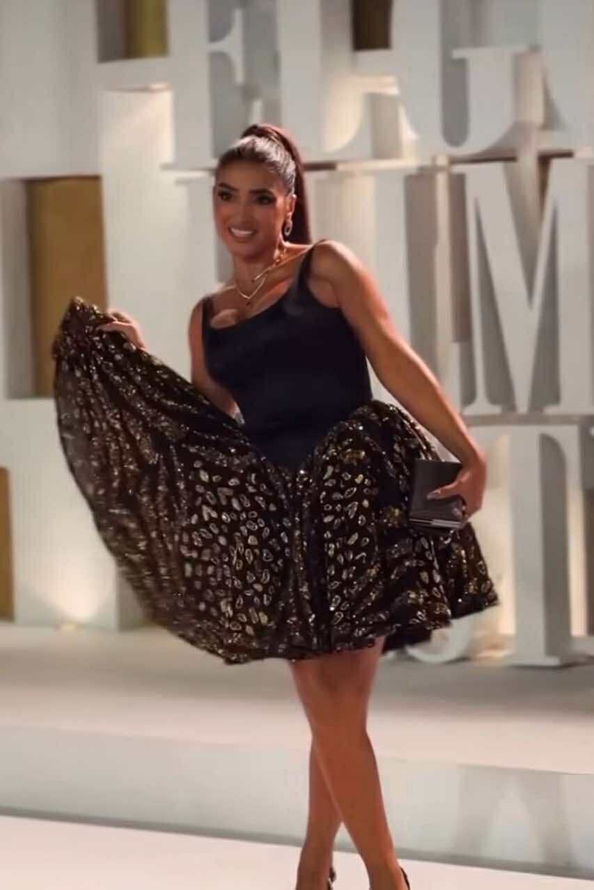 وبدت روجينا بإطلالة متوجهه مستوحاه من شقاوة و خفة ظل النجمة الراحلة سعاد حسني، لتستحضر إطلالتها في فليمها الشهير "صغيرة على الحب"، مرتديه فستان قصير مجسم من أعلى و منفوشا من أسفل، صمم من قماش الساتان والترتر باللون الأسود الفستان عكس قوامها الرشيق ووزنها المثالي.