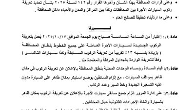 وكلف " المحافظ " الإدارة العامة للمواقف بالمحافظة بالتنسيق مع رؤساء المراكز والمدن والاحياء ، وشرطة المرور، وطباعة ولصق استيكرات التعريفة الجديدة على مركبات النقل الداخلي والخارجي والتاكسي، وإلزام السائقين بعرض التعريفة بشكل واضح للمواطنين، مع مراجعة يومية للمركبات بالمواقف ونقاط التحميل واتخاذ الإجراءات فورًا ضد أي محاولة إخفاء الأسعار أو تحصيل مبالغ زائدة.