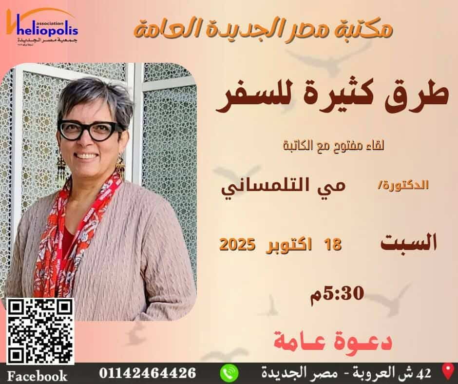 تستضيف مكتبة مصر الجديدة العامة غدا السبت الكاتبة والروائية الدكتورة مي التلمساني، في لقاء مفتوح، لمناقشة كتابها “طرق كثيرة للسفر”.