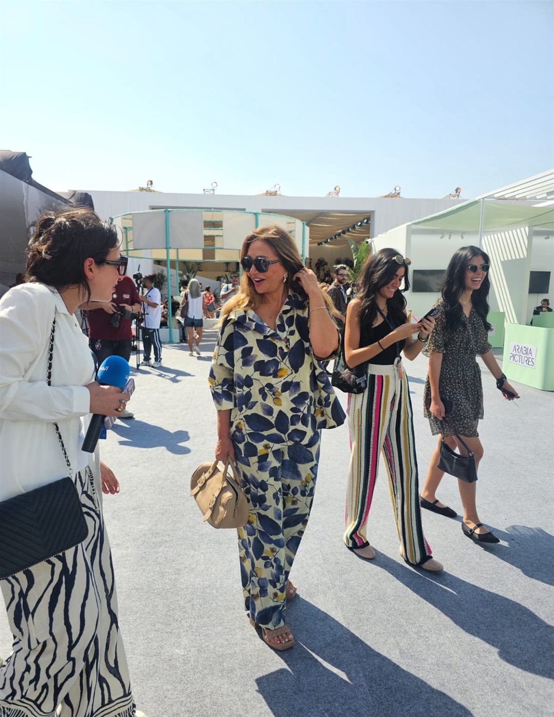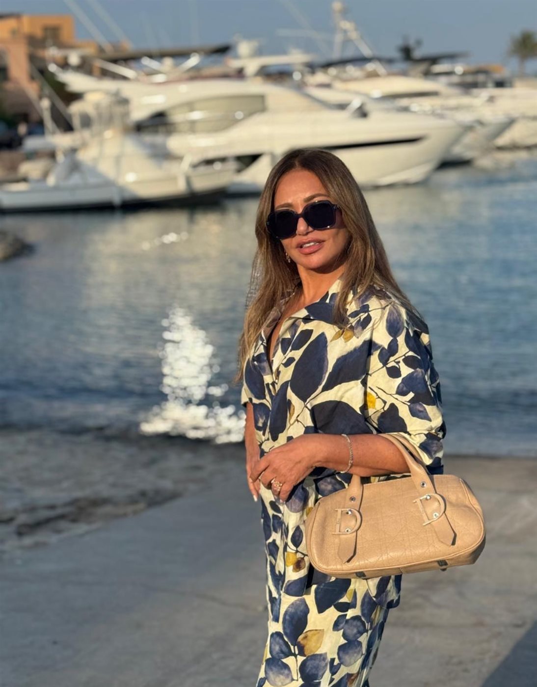وظهرت ليلى علوي ببيجاما مطبوعة بأوراق الشجر باللون الأزرق ، ضمت قميص بأكمام وبنطلون، حملت حقيبة جلد باللون البيج.