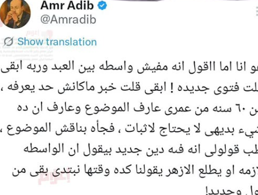 وقال عمرو أديب: “هو أنا لما القول انه مفيش واسطه بين العبد وربه ابقى قلت فتوى جديده ! ابقى قلت خبر ماكانش حد يعرفه ، من ٦٠ سنه من عمرى عارف الموضوع وعارف ان ده شيء بديهى لا يحتاج لاثبات”.