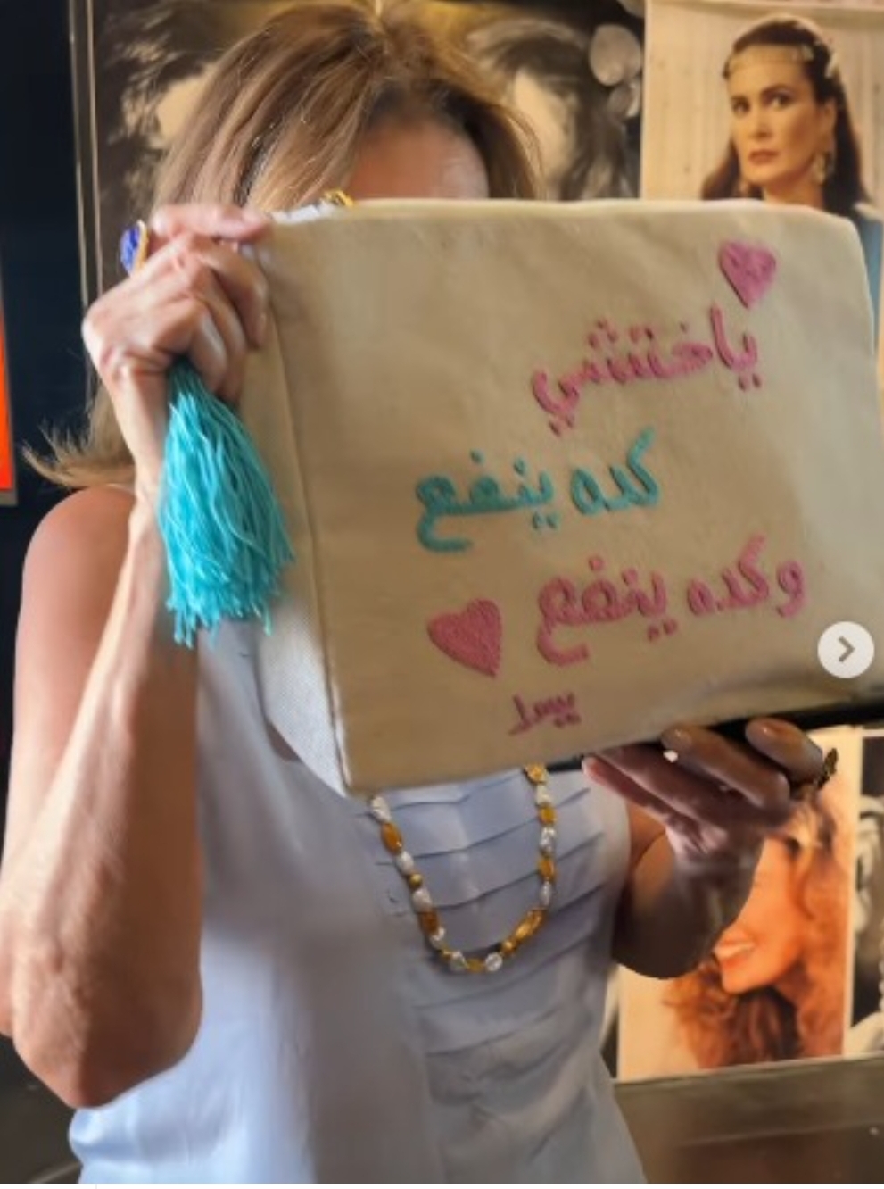 وقد حملت الحقيبة عبارة: "يا أختي كده ينفع وكده ينفع"، المأخوذة من أحد مشاهدها الأيقونية في فيلم "طيور الظلام"، والتي أصبحت جزءًا من الذاكرة السينمائية للمشاهد العربي، ومصدرًا للعبارات المتداولة حتى اليوم.