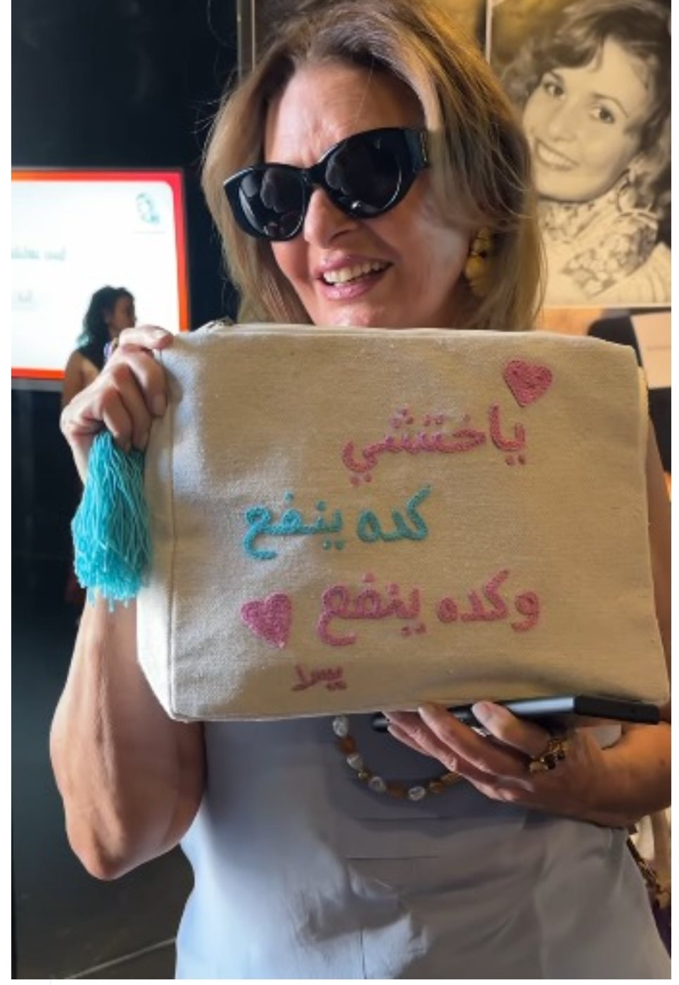 في لفتة فنية ذكية جمعت بين الأناقة والهوية السينمائية، خطفت الفنانة الكبيرة يسرا الأنظار خلال ظهورها في ثالث أيام مهرجان الجونة السينمائي، بحقيبة يد غير تقليدية مطرزة بإحدى أشهر عباراتها السينمائية.