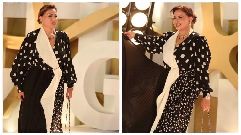 تألقت إلهام شاهين أمام عدسات المصورين بإطلالة جذابة، حيث ارتدت فستانًا يجمع بين اللونين الأبيض والأسود، لتضفي لمسة من الرقي والكلاسيكية على إطلالتها في المهرجان.
